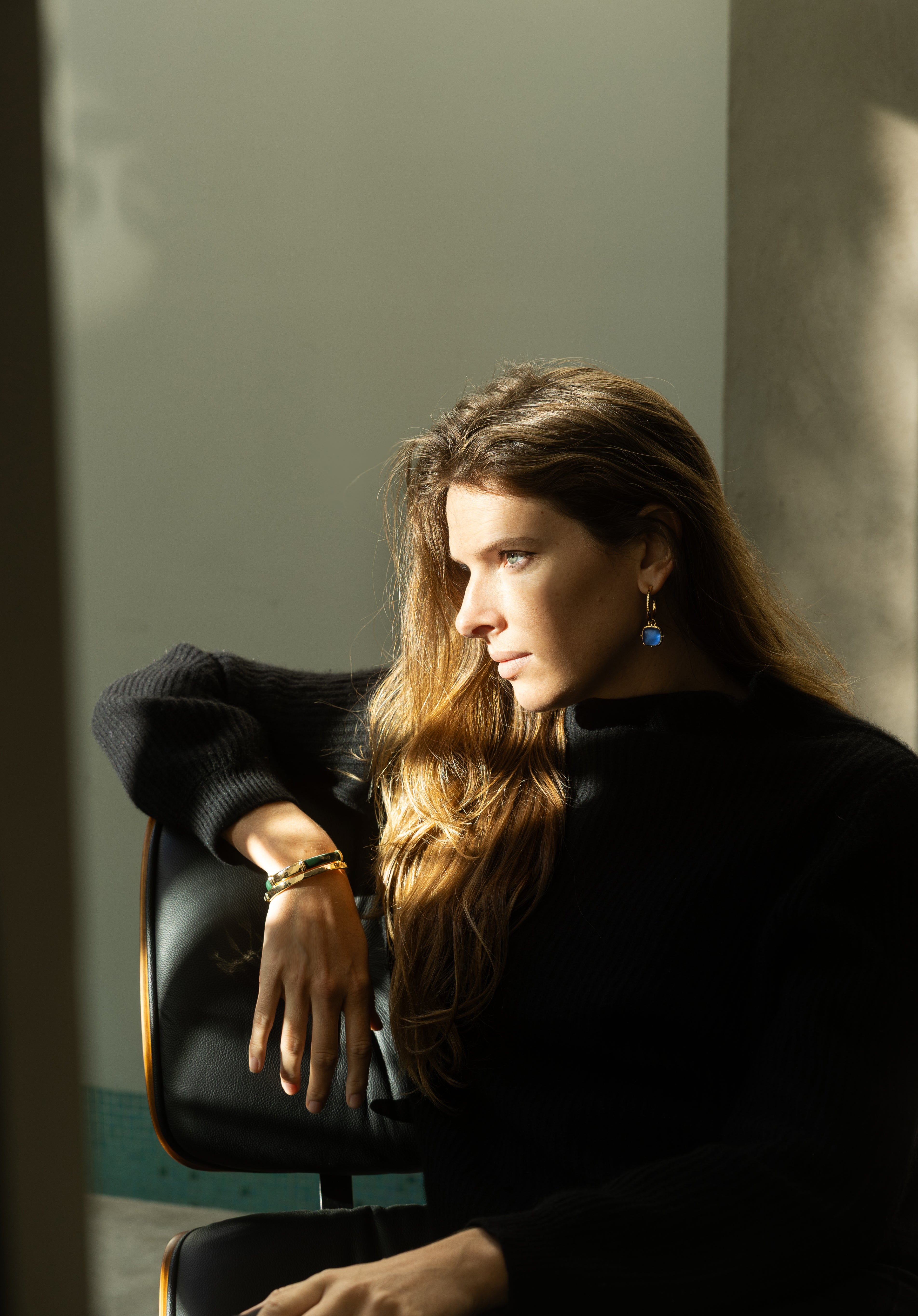 Anabel Aram Jewelry is made with nickel-free brass and dipped in 18k gold. Pieces with embellishments are hand set with crystals.
